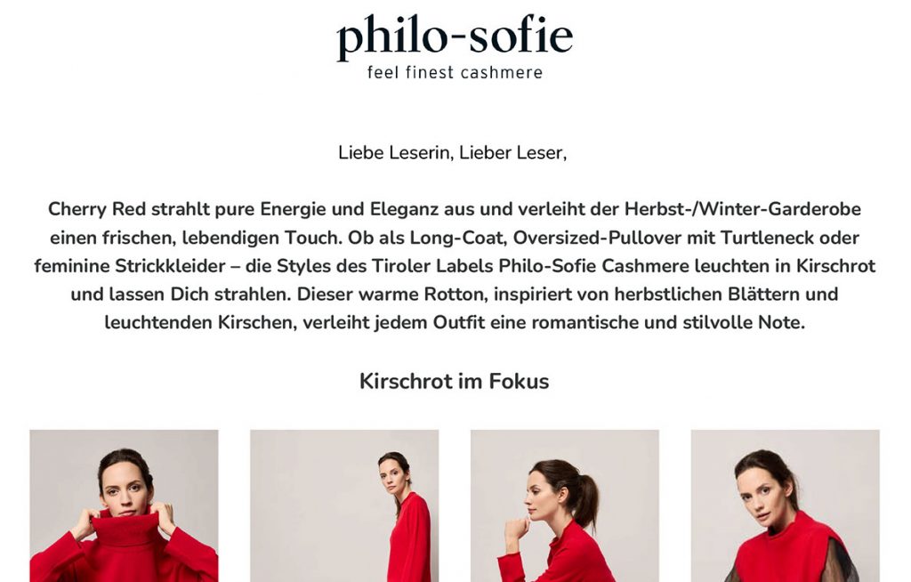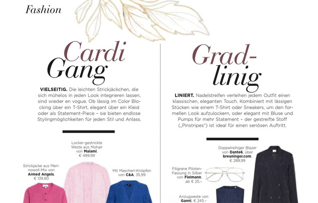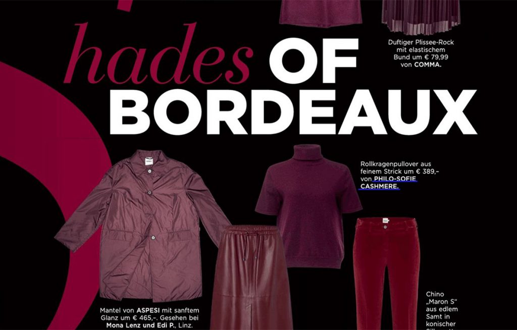 Press Ok Magazin, 02.2026 Moments, 02.2026 Kleine Zeitung, 12.2025 Moments, 11.2025 ida Anzüglich, 11.2025 Moments, 11.2025 Moments, 10.2025 Brigitte, 10.2025 Weekend Style, 09.2025 philo-sofie, 09.2025 AVIDA, 09.2025 Die Salzburgerin, 07.2025 Sat.1, 07.2025 Sat.1, 07.2025 Sat.1, 07.2025 TextilWirtschaft, 07.2025 philo-sofie, 04.2025 KURIER, 03.2025 Weekend Style, 12.2024 philo-sofie, 12.2024 AVIDA, 11.2024 philo-sofie, 10.2024 Weekend Style, 09.2024 Salzburger Nachrichten, 09.2024 KURIER, 09.2024 Freundin, 09.2024 Die Salzburgerin, 09.2024 Moments, 08.2024 Weekend Magazin, 07.2024 Woman Balace, 04.2024 courage, 03.2024 alverde, 03.2024 Woman Balance, 03.2024 SHOPPING GUIDE, 20.02.2024 FRAU IM SPIEGEL, 01.2024 ÖSTERREICHISCHE textilzeitung, 12.2023 Galileo Stories, 05.11.2023 burda style, 11.2023 KURIER, 30.09.2023 Moments, 07.2023 RHEINEXKLUSIV, 28.03.2023 DIE NIEDERÖSTERREICHERIN, 02.2023 FRAU IM SPIEGEL, 01.2023 falstaff LIVING, 01.2023