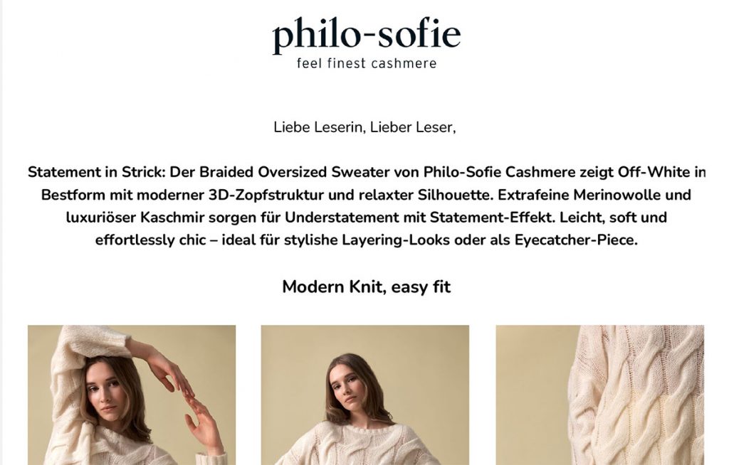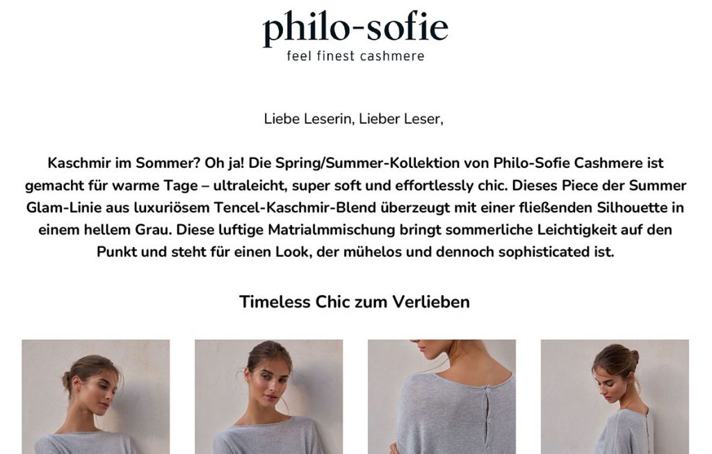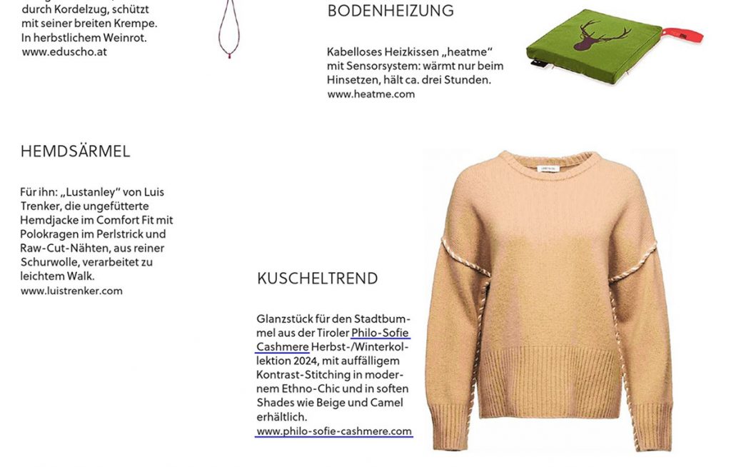Presse Ok Magazin, 02.2026 Moments, 02.2026 Kleine Zeitung, 12.2025 Weekend Style, 11.2025 ida Anzüglich, 11.2025 Moments, 11.2025 Moments, 10.2025 Brigitte, 10.2025 Weekend Style, 09.2025 philo-sofie, 09.2025 AVIDA, 09.2025 Die Salzburgerin, 07.2025 Sat.1, 07.2025 Sat.1, 07.2025 Sat.1, 07.2025 TextilWirtschaft, 07.2025 philo-sofie, 04.2025 KURIER, 03.2025 Weekend Style, 12.2024 philo-sofie, 12.2024 AVIDA, 11.2024 philo-sofie, 10.2024 Weekend Style, 09.2024 Salzburger Nachrichten, 09.2024 KURIER, 09.2024 Freundin, 09.2024 Die Salzburgerin, 09.2024 Moments, 08.2024 Weekend Magazin, 07.2024 Woman Balace, 04.2024 courage, 03.2024 alverde, 03.2024 Woman Balance, 03.2024 SHOPPING GUIDE, 20.02.2024 FRAU IM SPIEGEL, 01.2024 ÖSTERREICHISCHE textilzeitung, 12.2023 Galileo Stories, 05.11.2023 burda style, 11.2023 KURIER, 30.09.2023 Moments, 07.2023 RHEINEXKLUSIV, 28.03.2023 DIE NIEDERÖSTERREICHERIN, 02.2023 FRAU IM SPIEGEL, 01.2023 falstaff LIVING, 01.2023